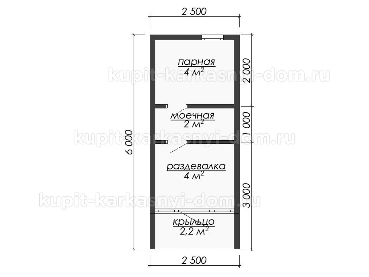 Проект одноэтажной бани барнхаус 6 на 2.3 м, площадью 12.2 м2, с прямой крышей и крыльцом.
