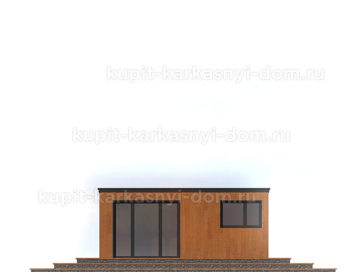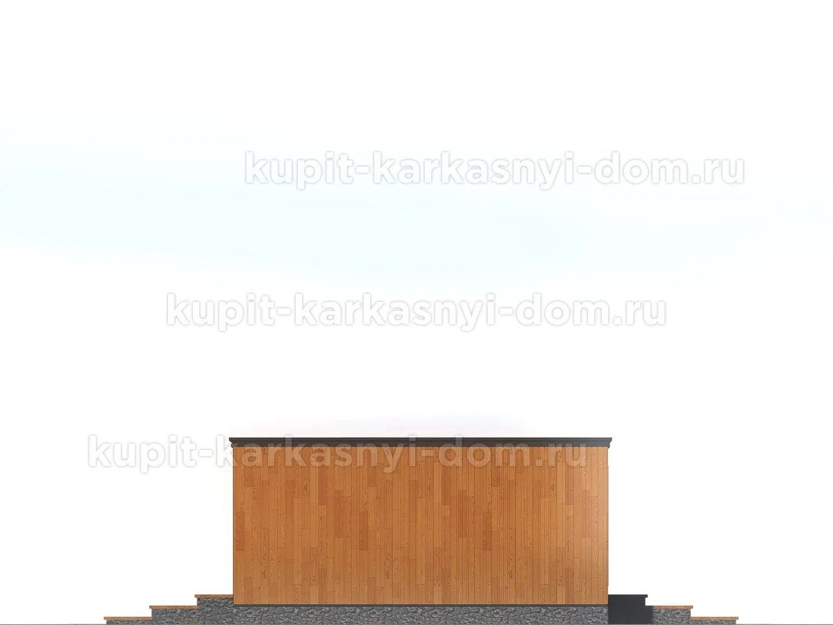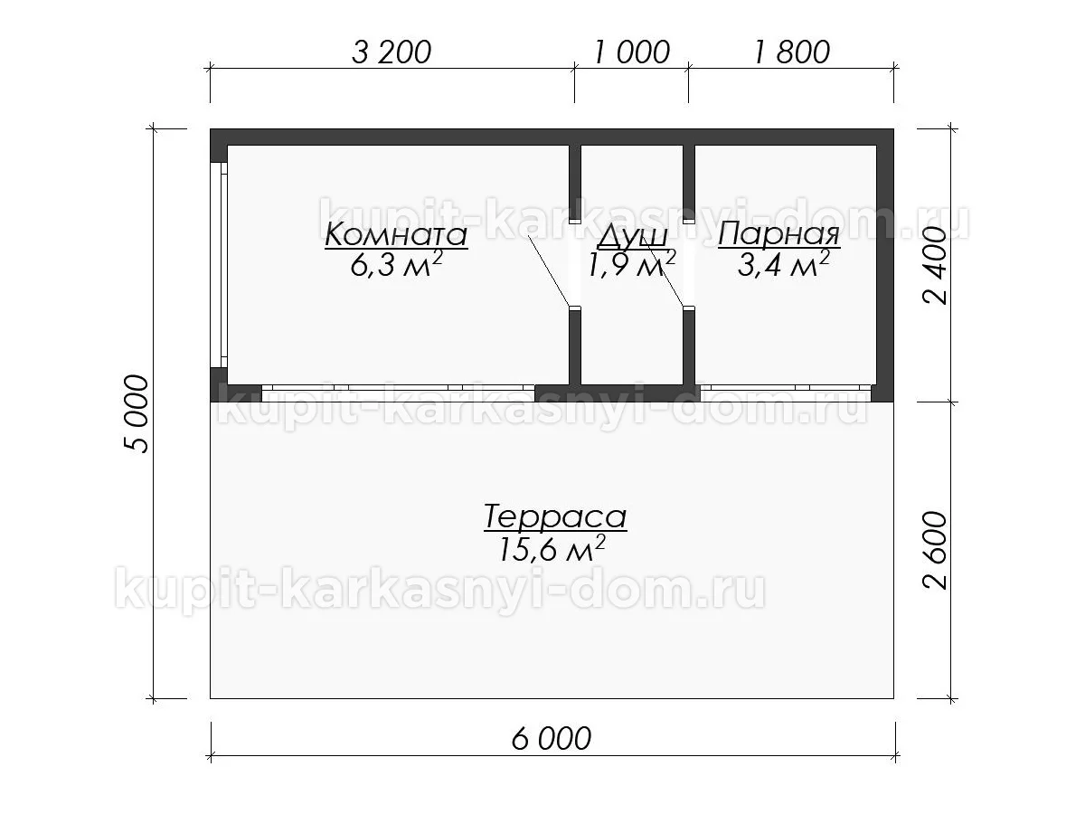 Проект одноэтажной бани барнхаус 6 на 5 метров, площадью 27.2 м2, c прямой крышей и террасой.