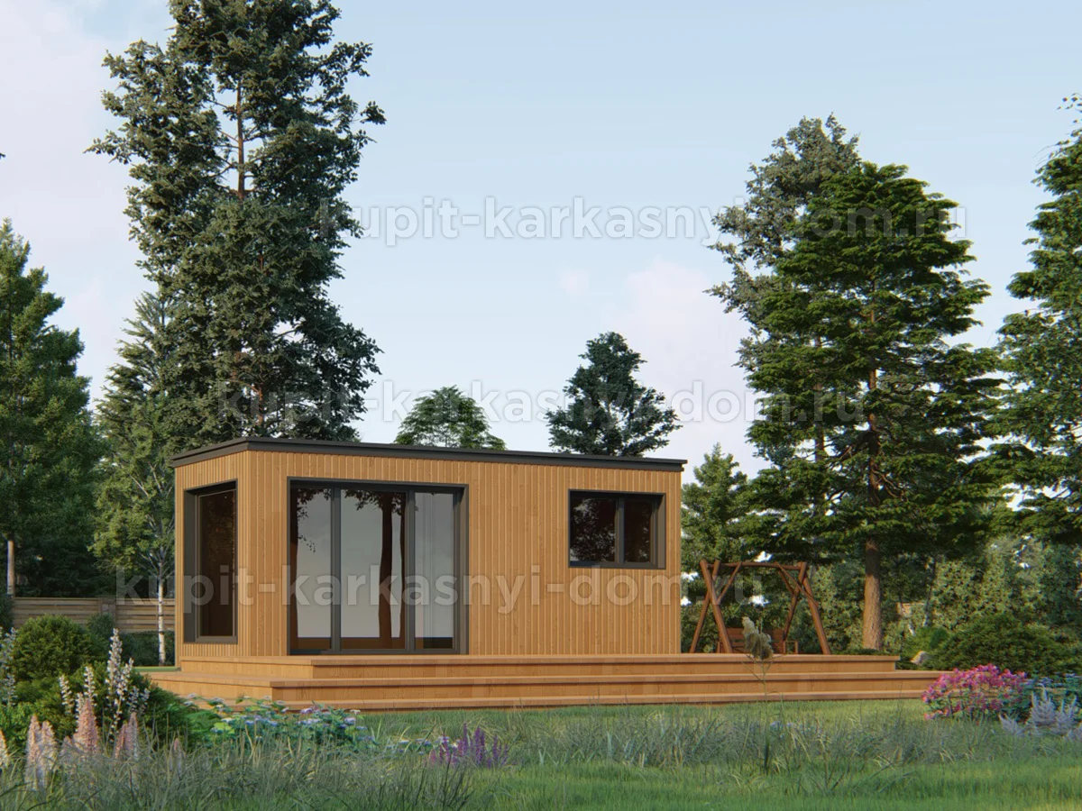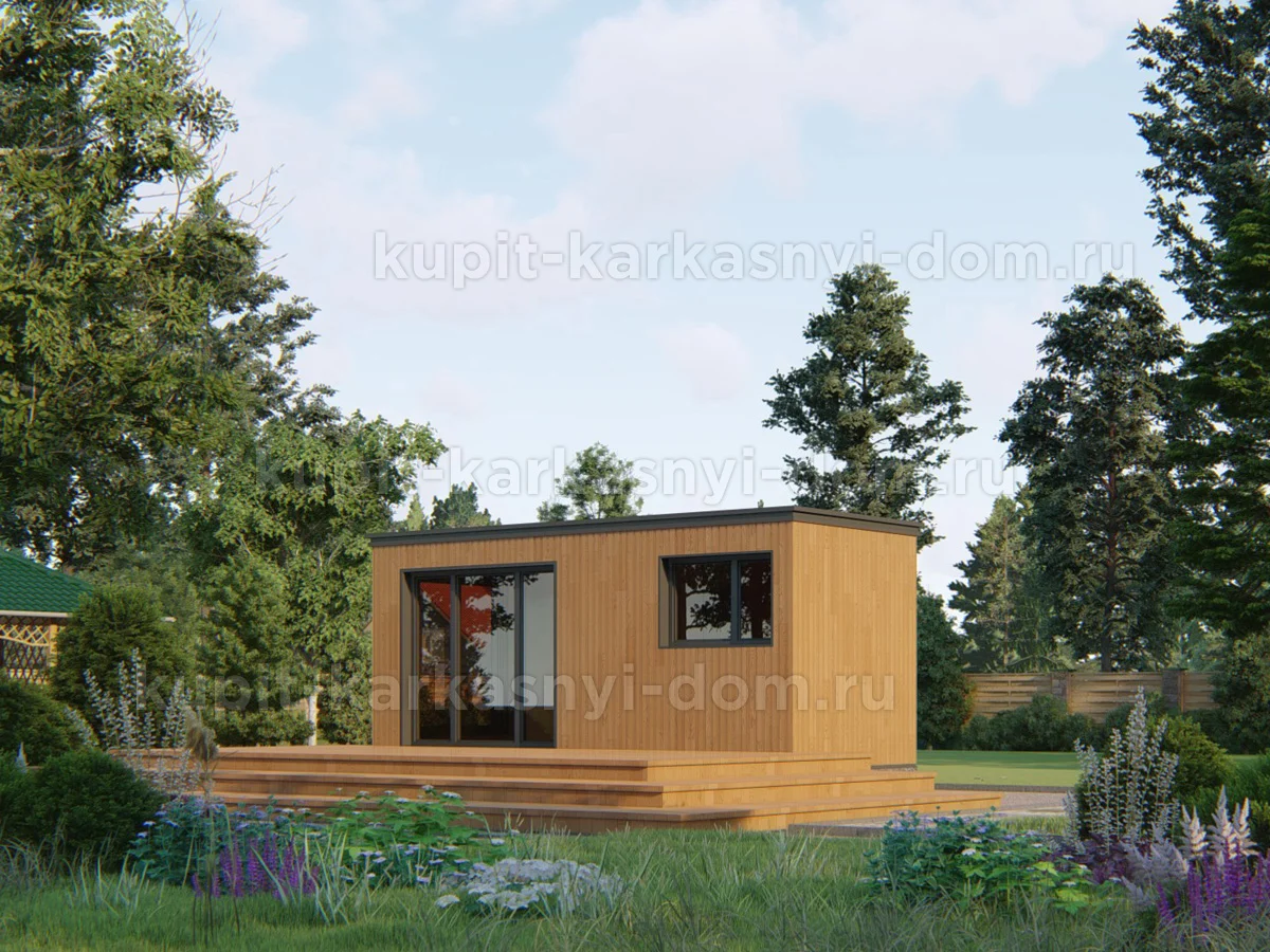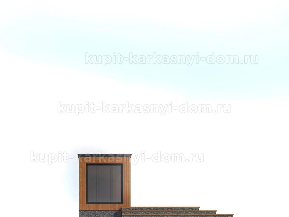 Проект одноэтажной бани барнхаус 6 на 5 метров, площадью 27.2 м2, c прямой крышей и террасой.