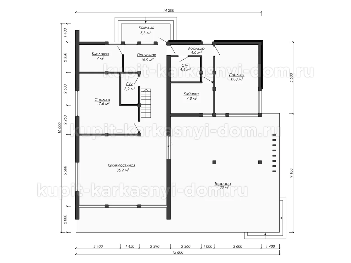 Проект полутороэтажного дома барнхаус 16 на 15.6 м, площадью 254.4 м2, с прямой крышей, террасой, крыльцом и двумя входами.