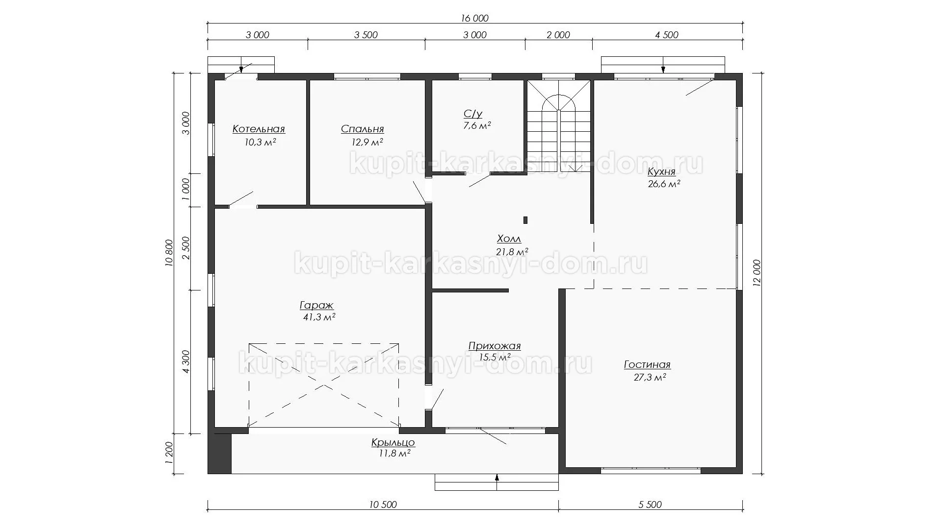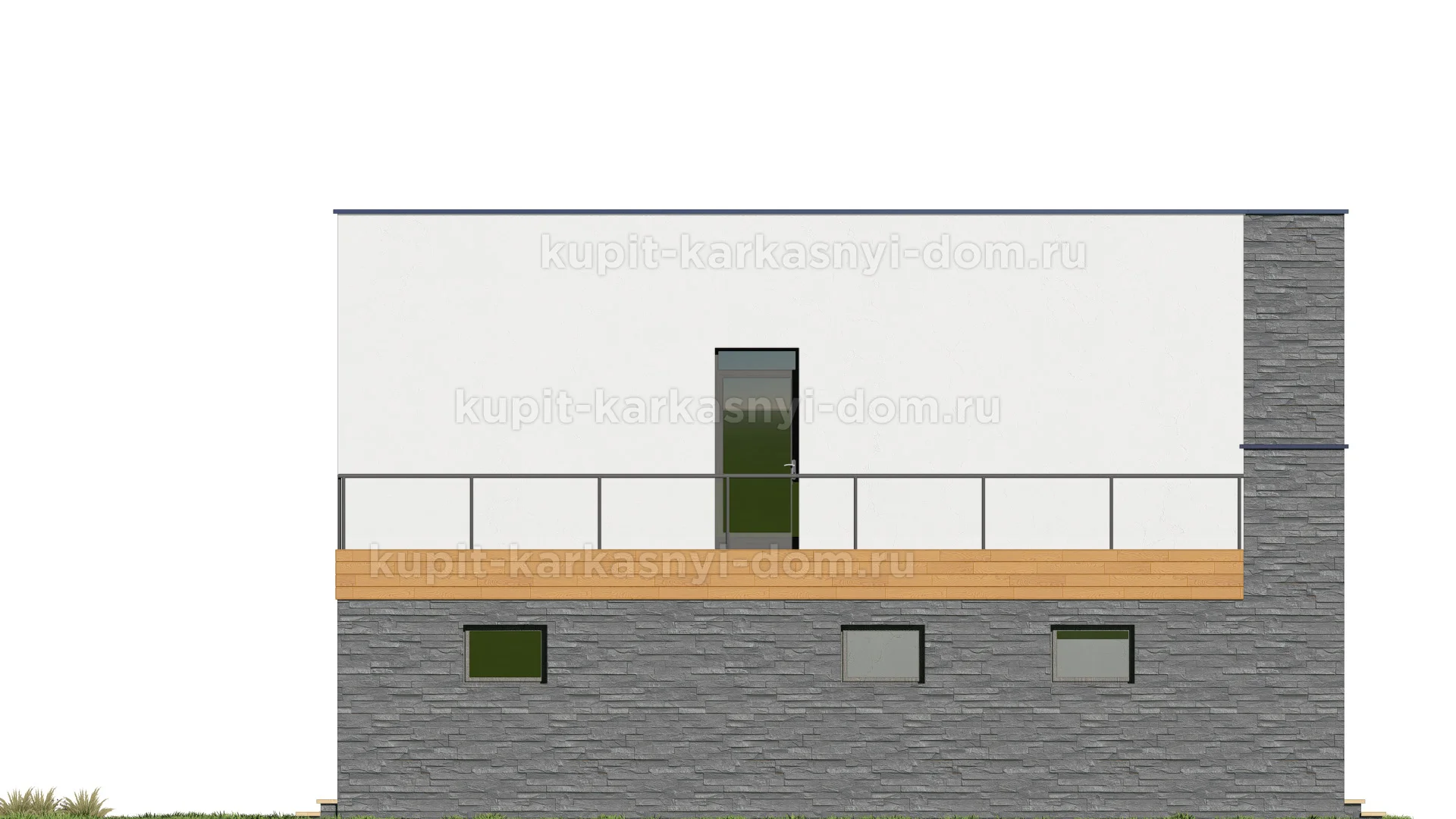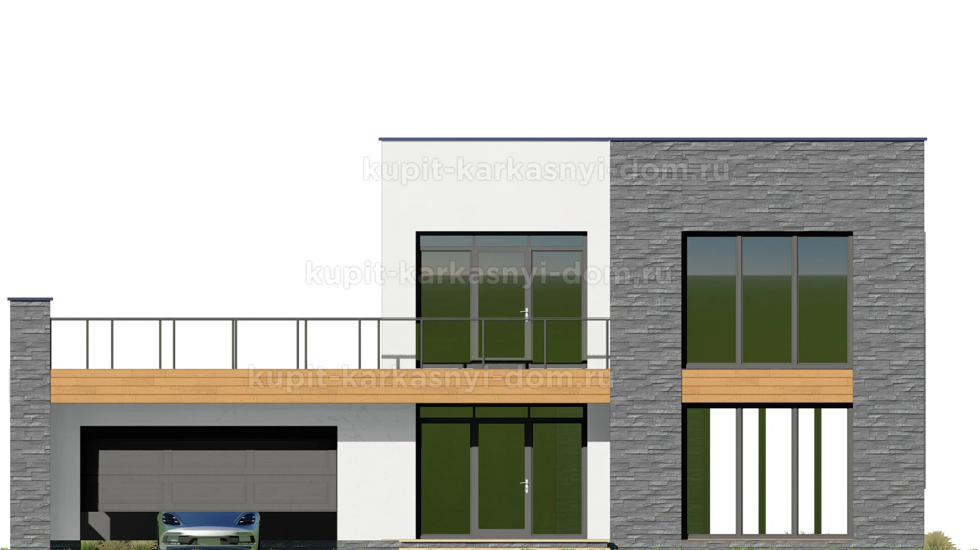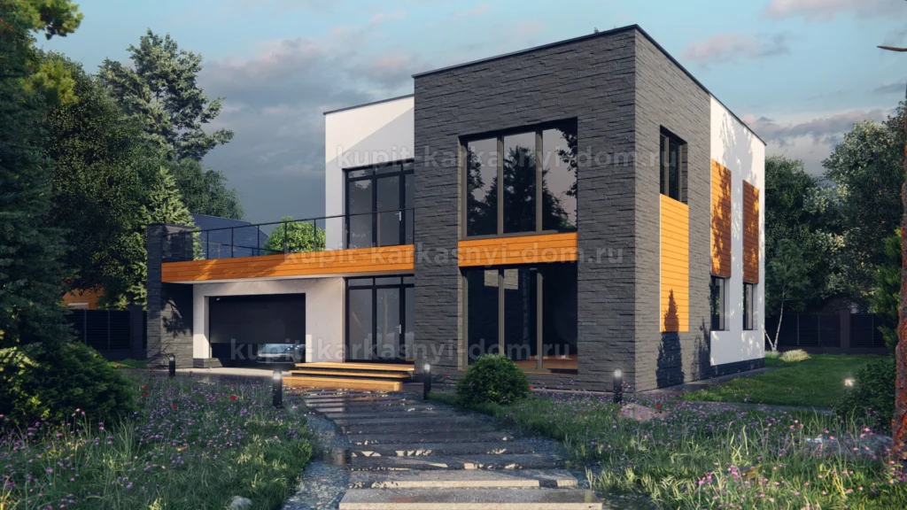 Проект двухэтажного дома хайтек 16 на 12 м, площадью 346.2 м2, с прямой крышей, балконом, крыльцом, топочной, двумя входами, гаражом.