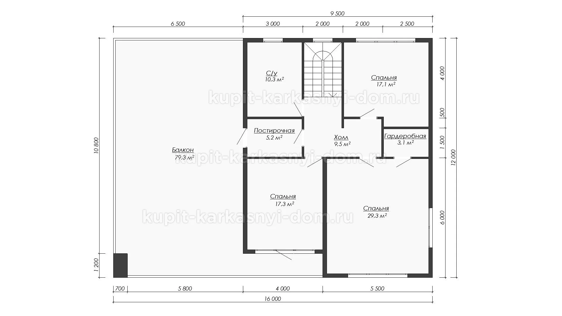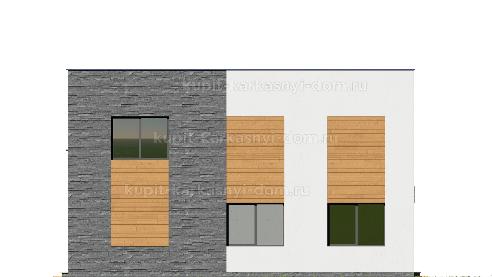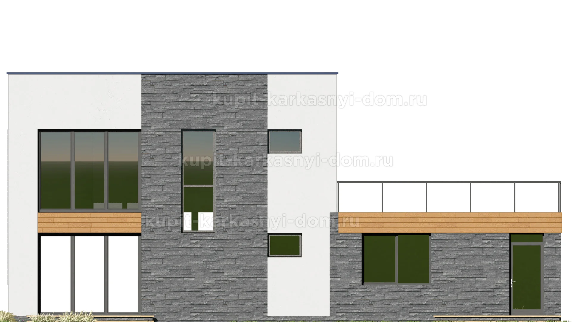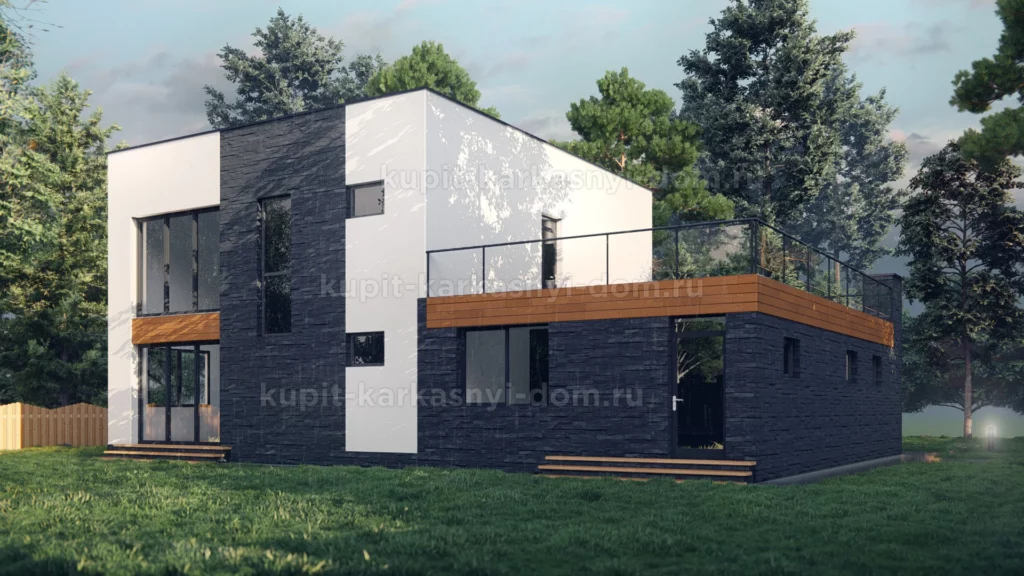 Проект двухэтажного дома хайтек 16 на 12 м, площадью 346.2 м2, с прямой крышей, балконом, крыльцом, топочной, двумя входами, гаражом.