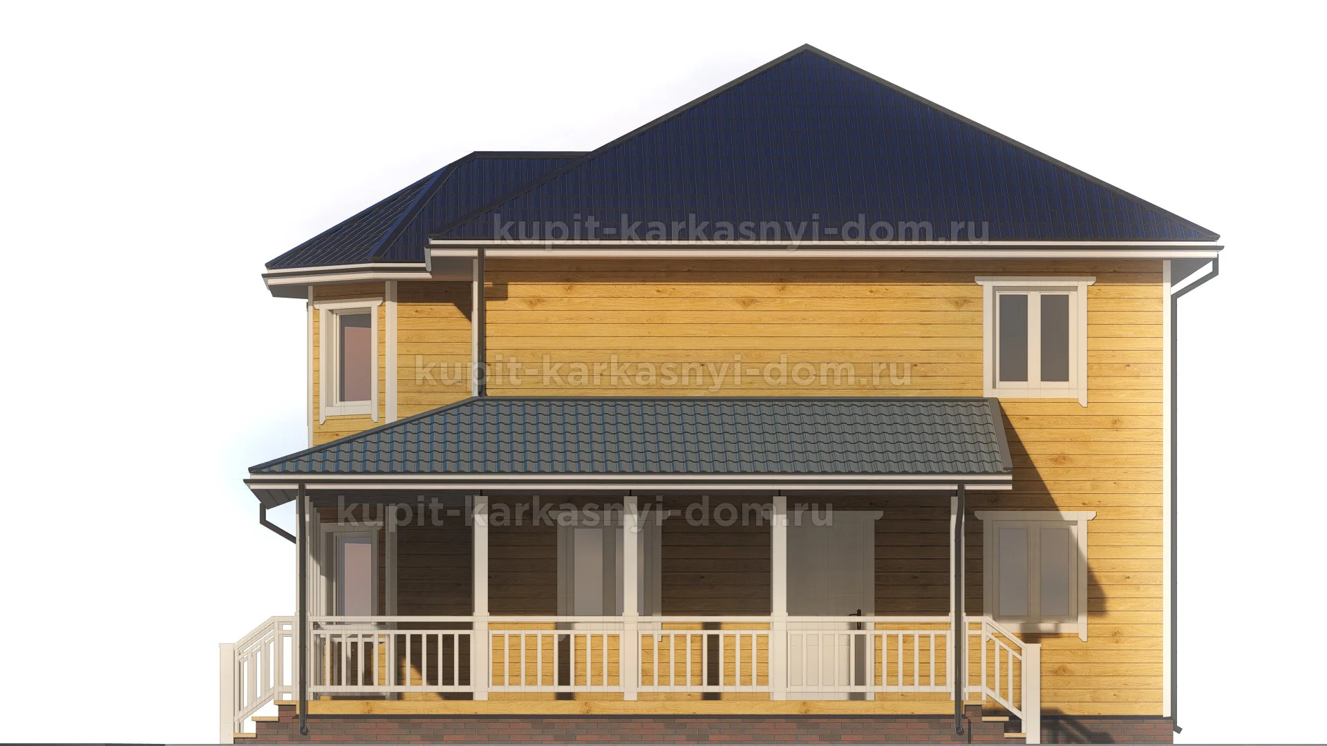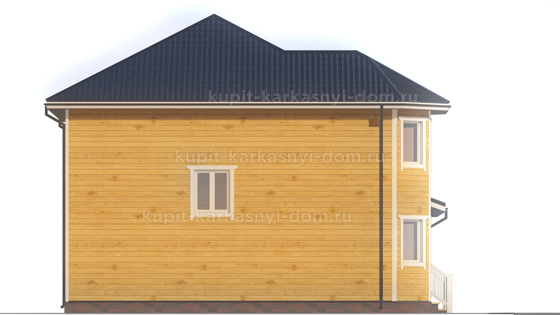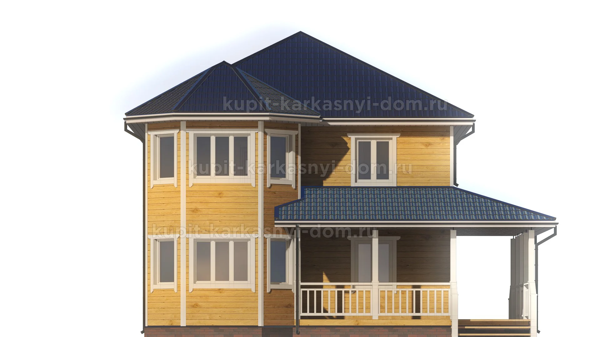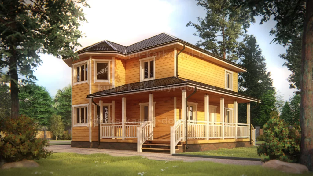 Проект двухэтажного дома из бруса 10 на 10 м, площадью 144 м2, с вальмовой крышей, террасой, эркером, топочной.