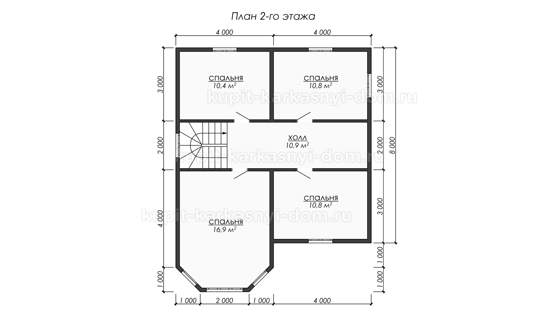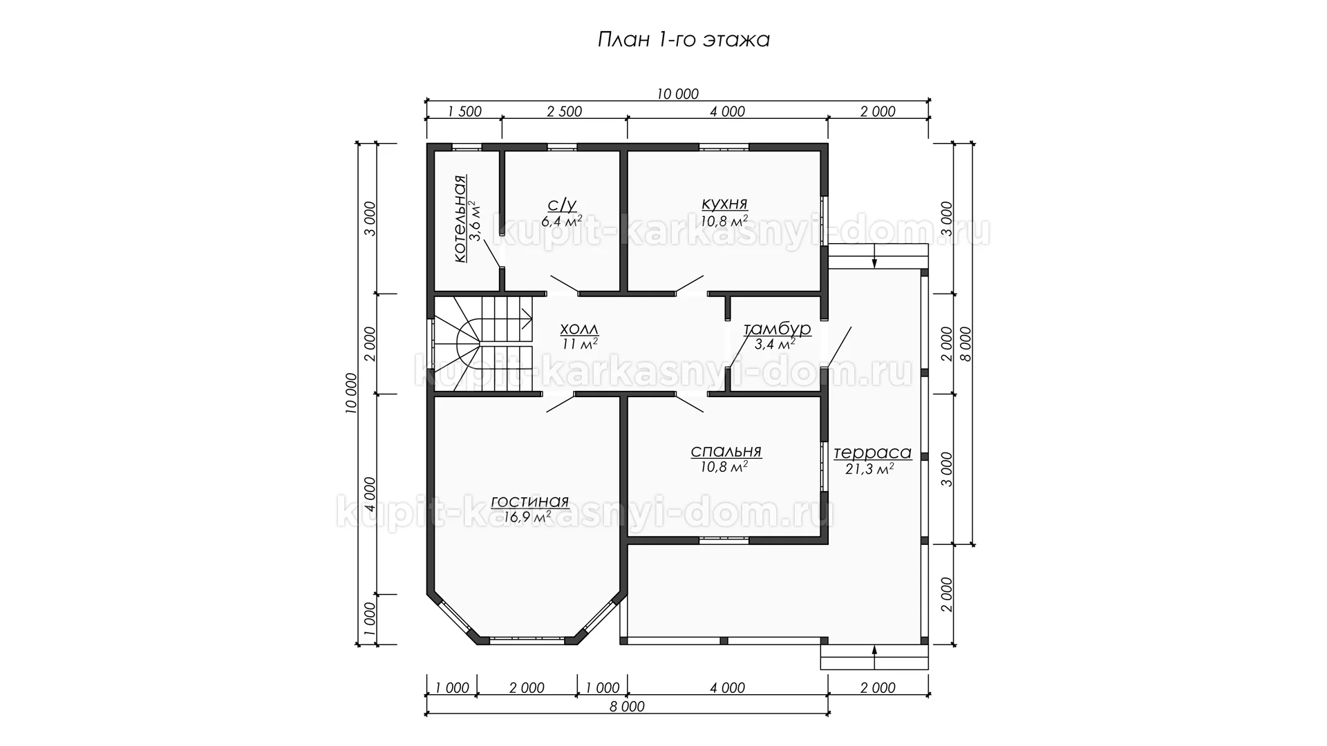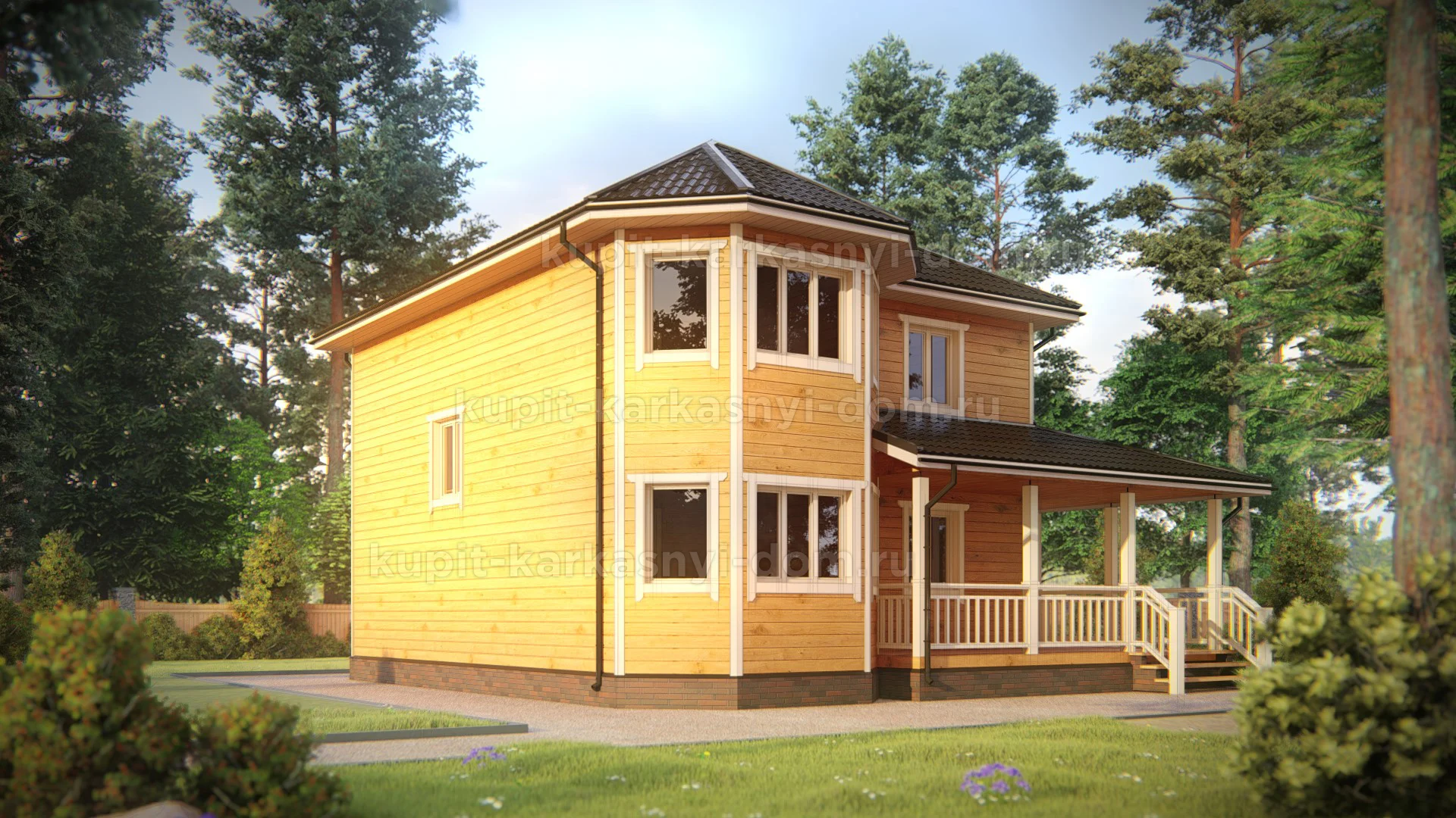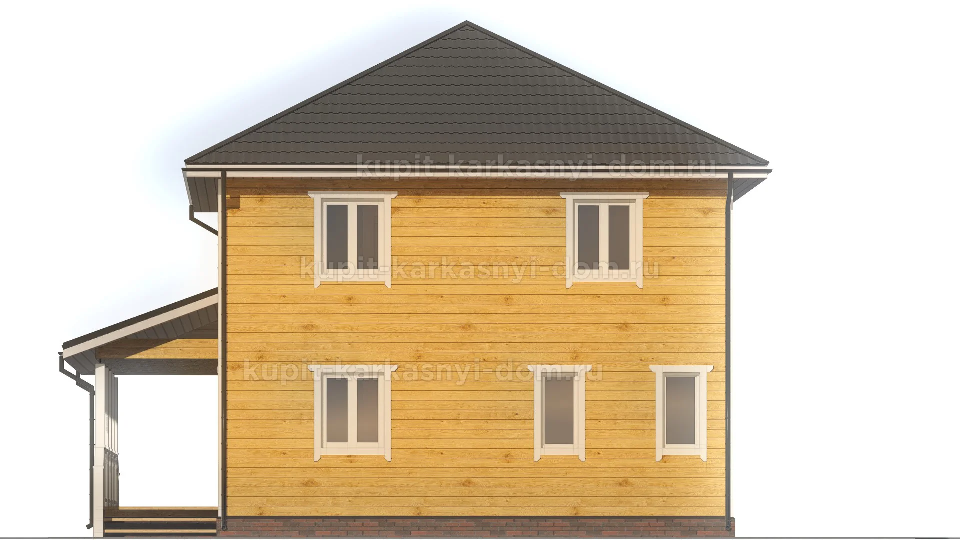 Проект двухэтажного дома из бруса 10 на 10 м, площадью 144 м2, с вальмовой крышей, террасой, эркером, топочной.