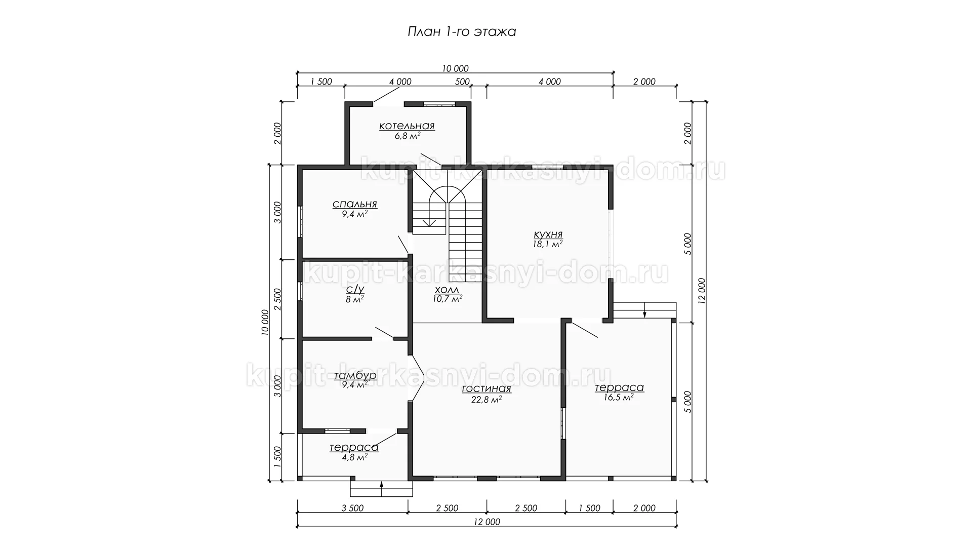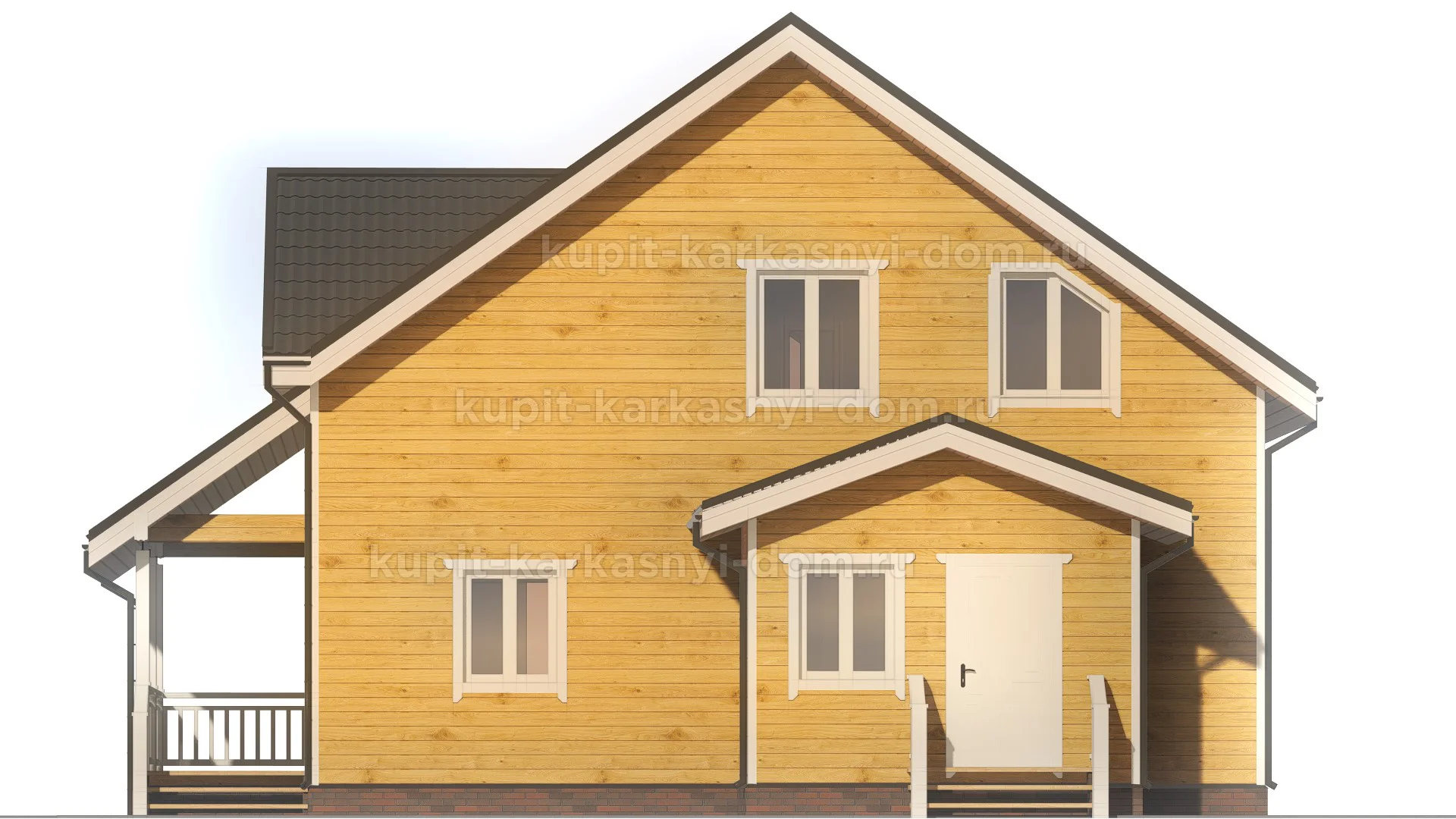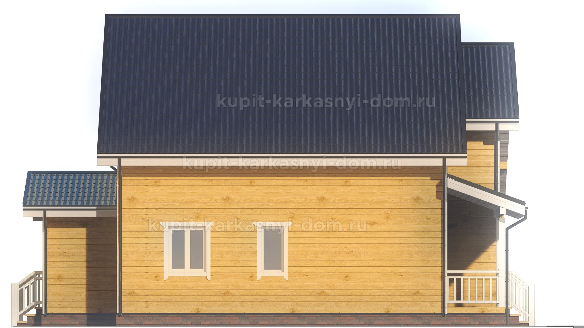 Проект полутораэтажного дома из бруса 12 на 10 м, площадью 179.7 м2, с прямой крышей, террасой, двумя входами, топочной.