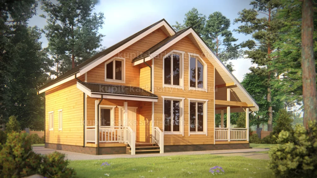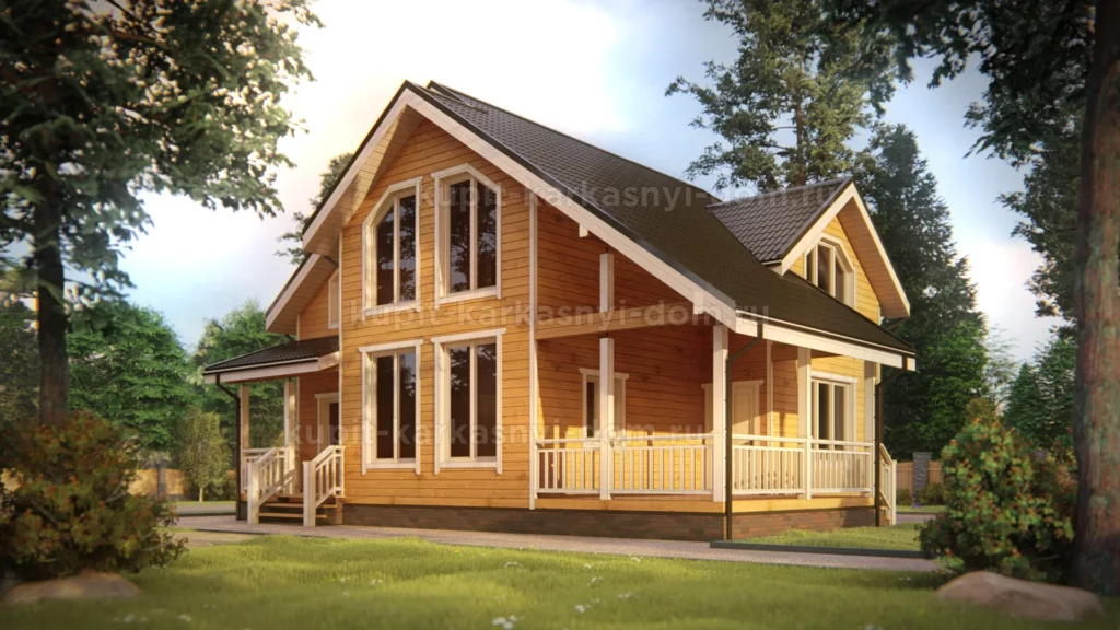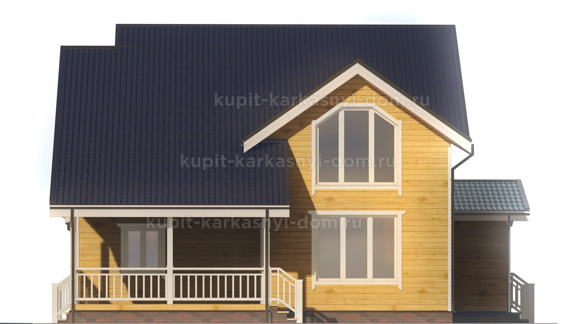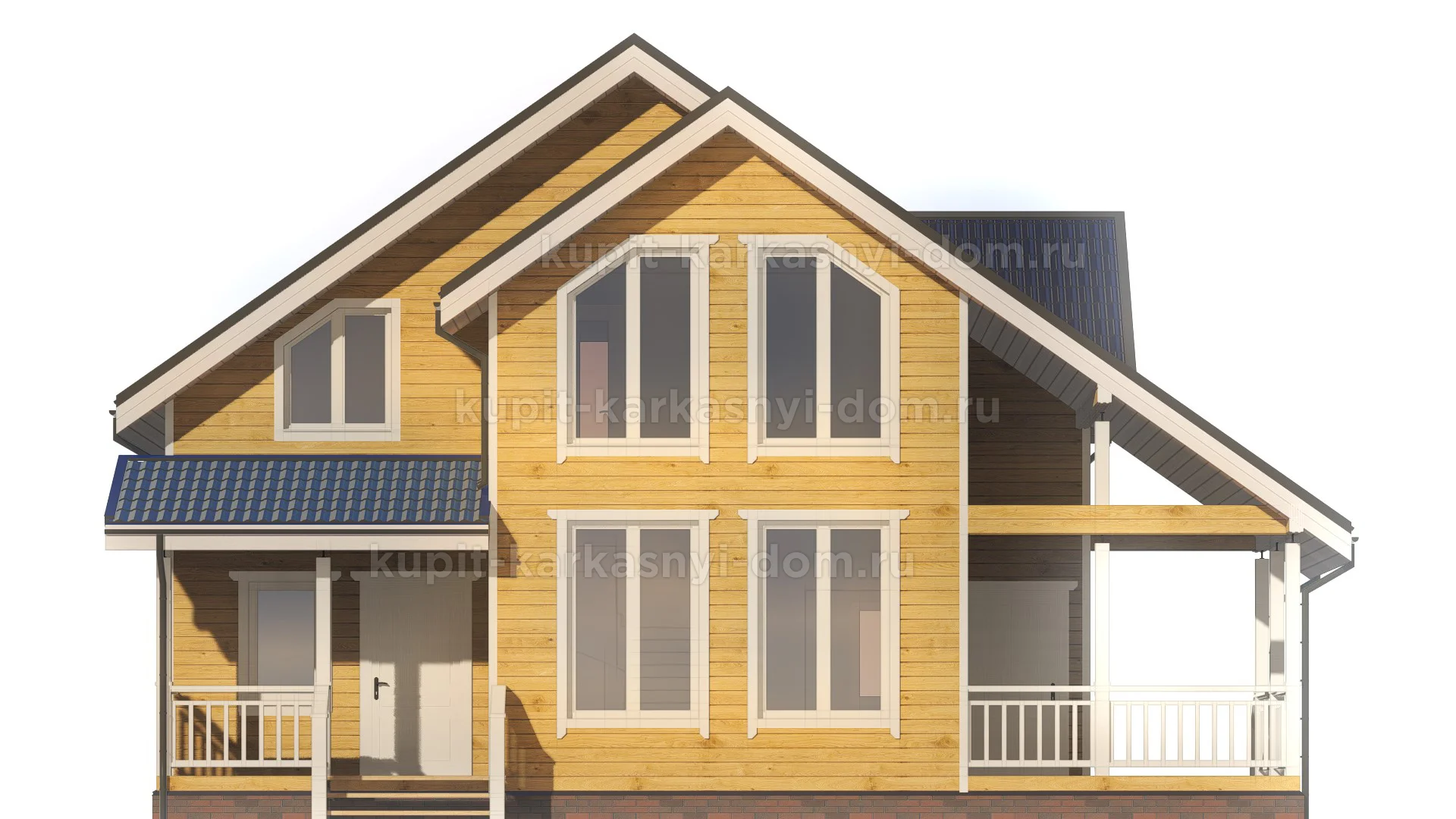 Проект полутораэтажного дома из бруса 12 на 10 м, площадью 179.7 м2, с прямой крышей, террасой, двумя входами, топочной.