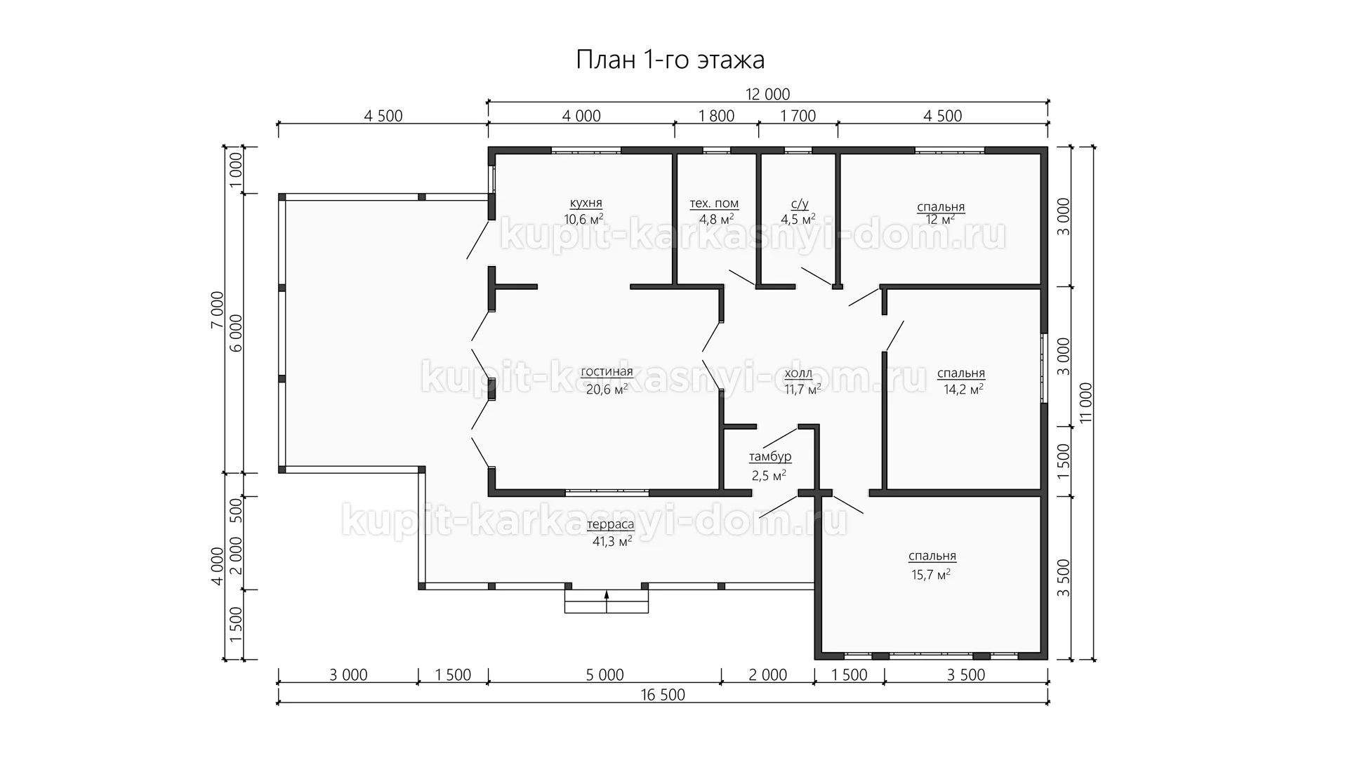 Проект одноэтажного дома из бруса 16.5 на 11 м, площадью 149.9 м2, с прямой крышей, террасой, топочной, двумя входами.