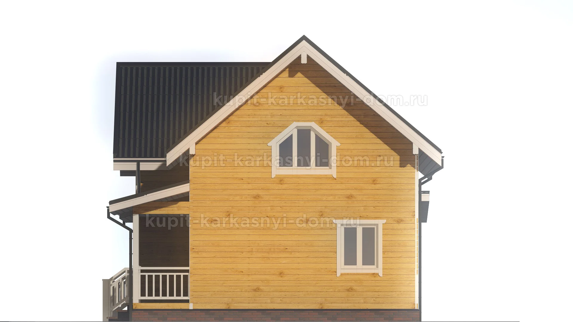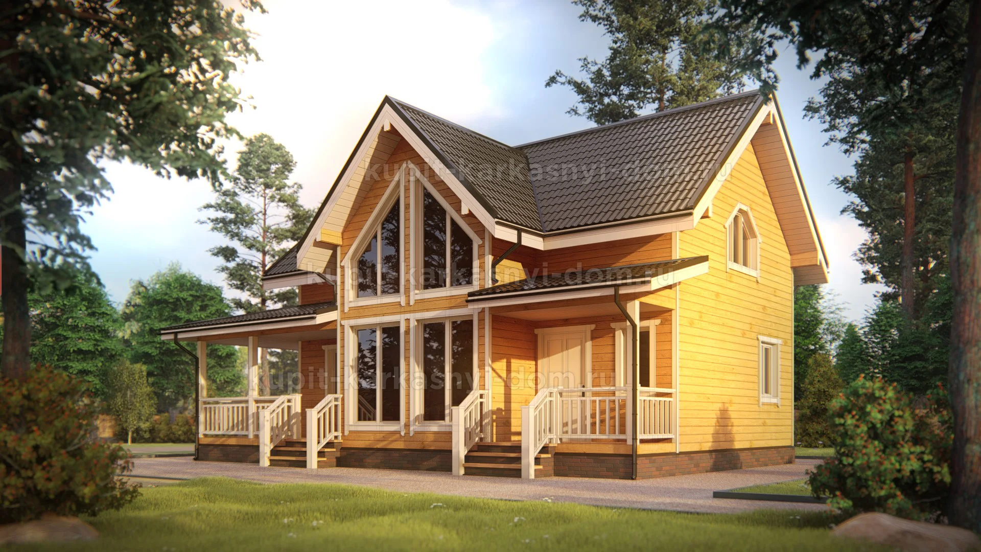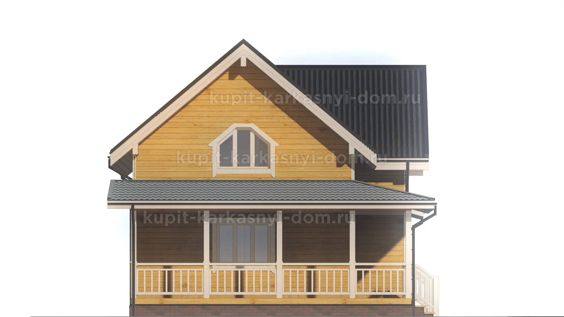 Проект полутораэтажного дома из бруса 12 на 7.5 м, площадью 137.2 м2, с прямой крышей, террасой, крыльцом, топочной, двумя входами.