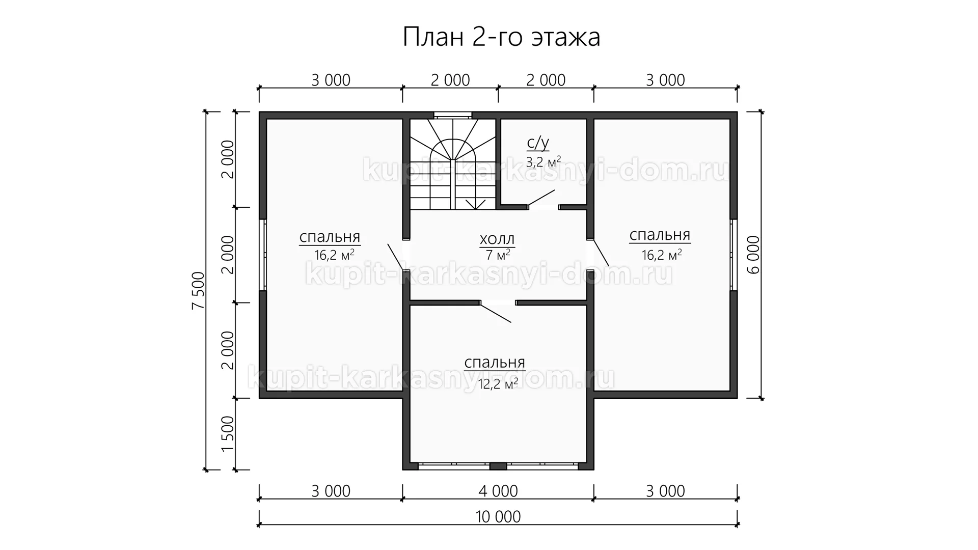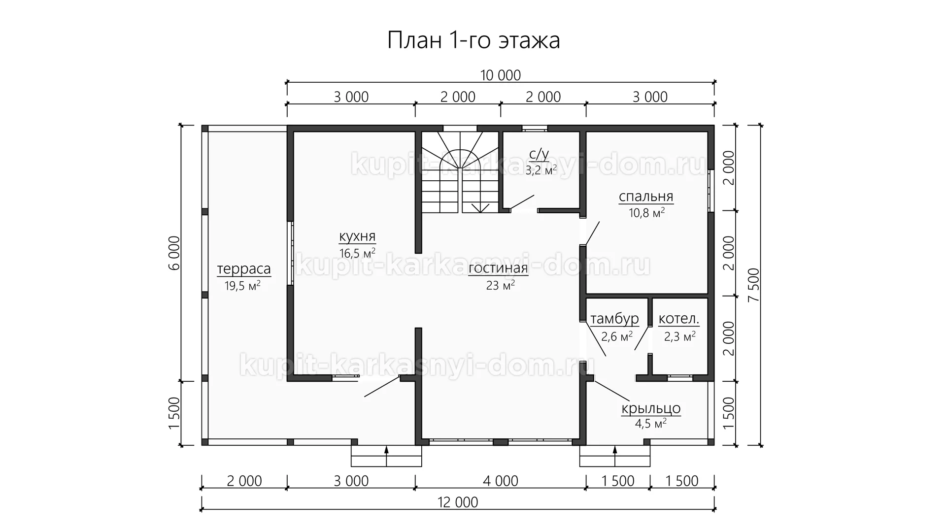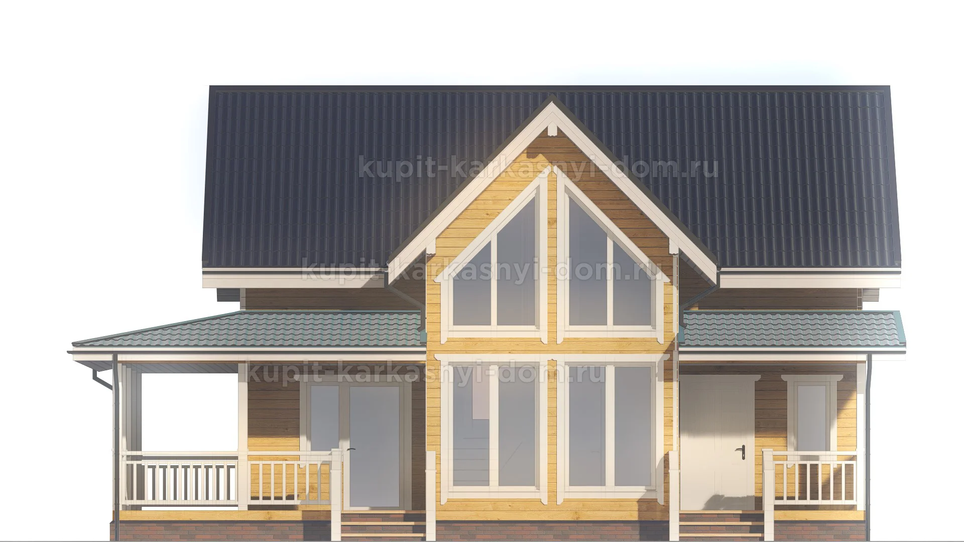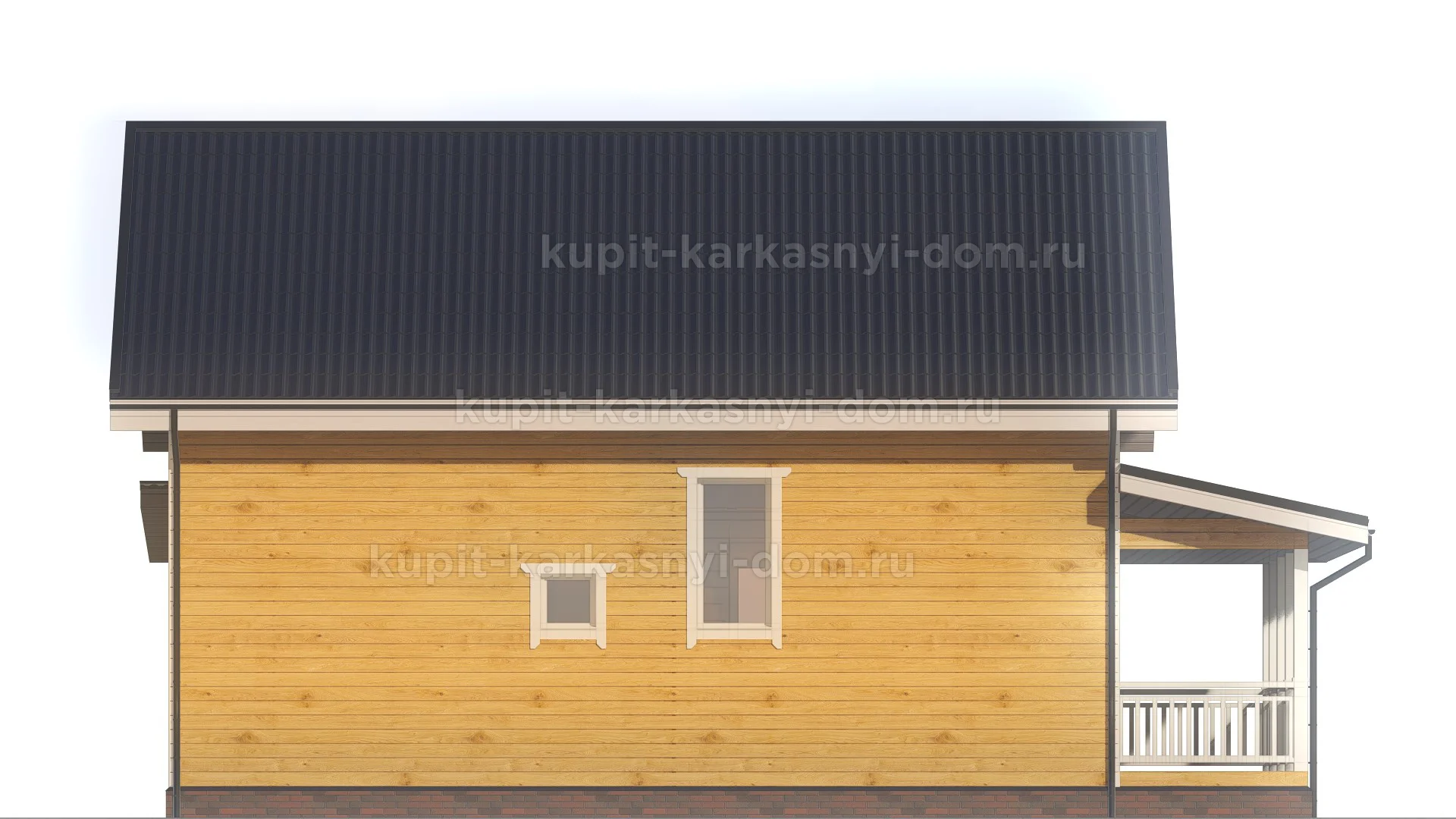 Проект полутораэтажного дома из бруса 12 на 7.5 м, площадью 137.2 м2, с прямой крышей, террасой, крыльцом, топочной, двумя входами.