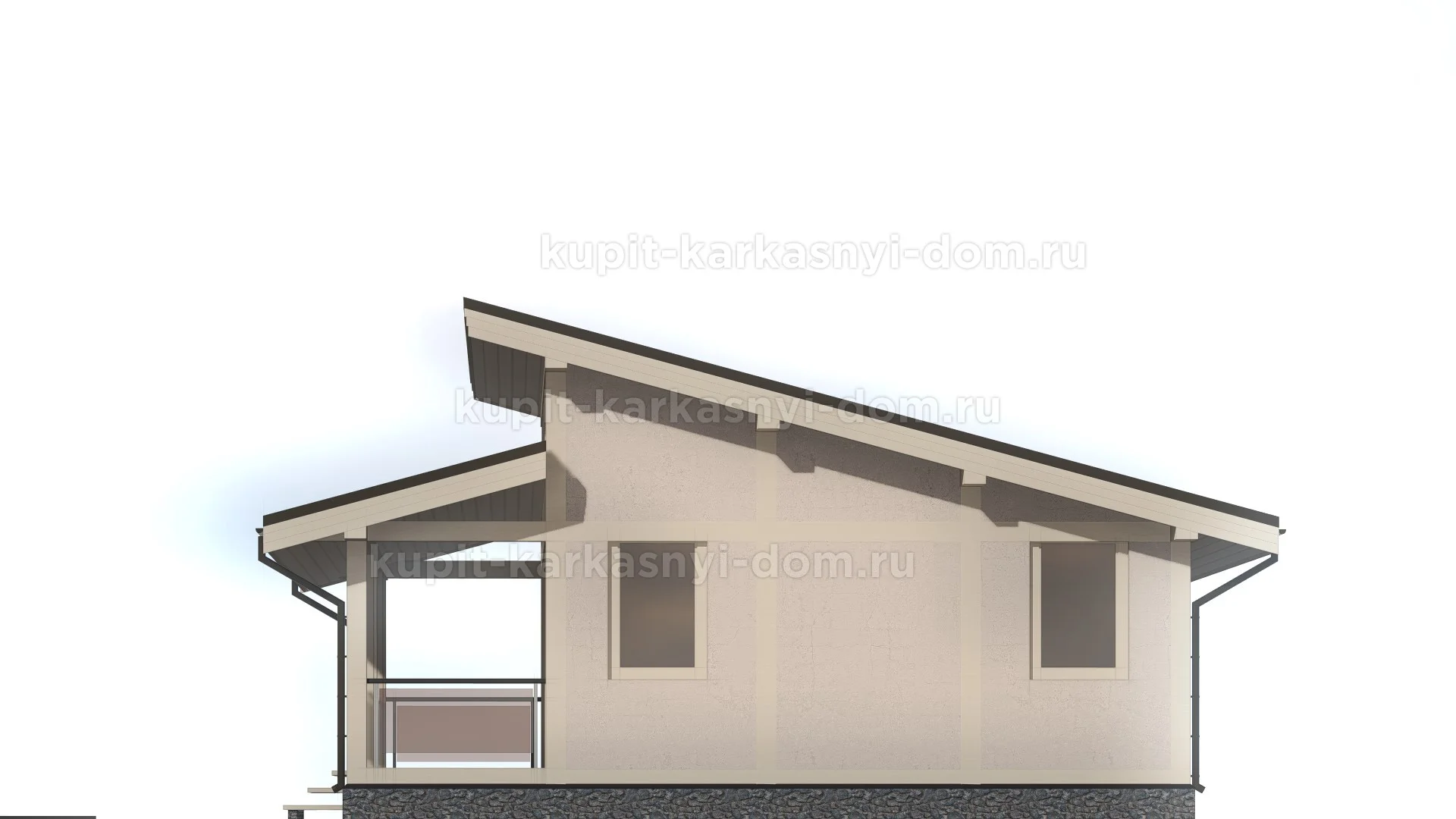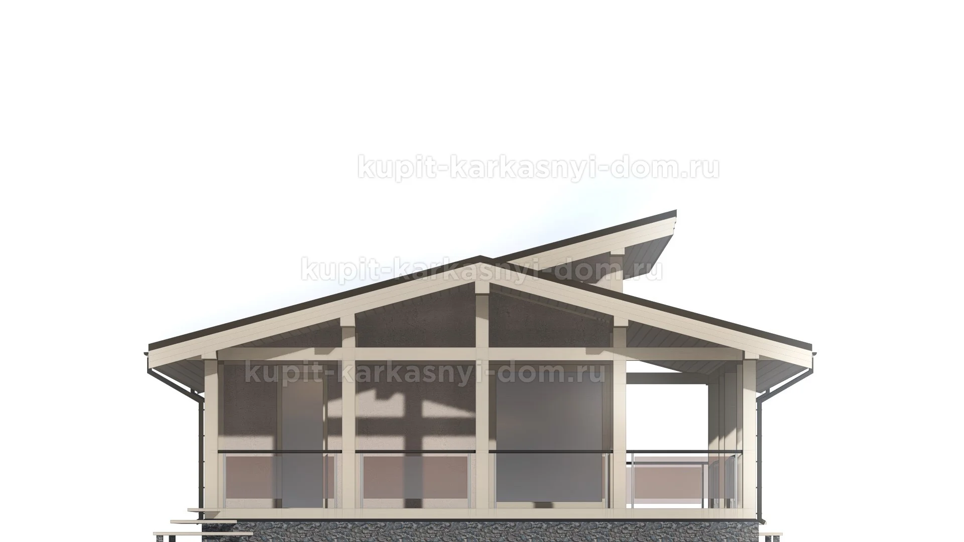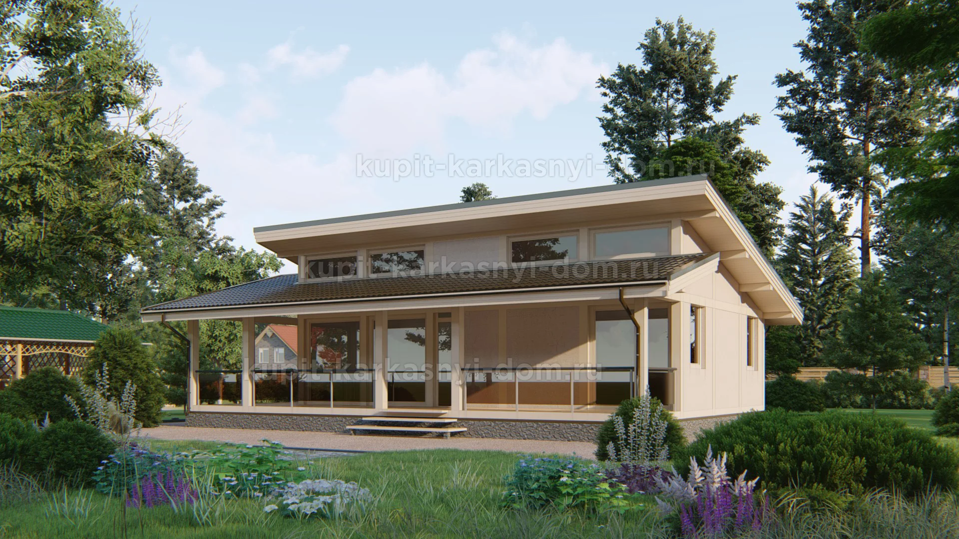 3D Проект одноэтажного фахверкового дома 12.4 на 8.3 метров, площадью 97.2 м2, c ассиметричной крышей, террасой, 2 входами.
