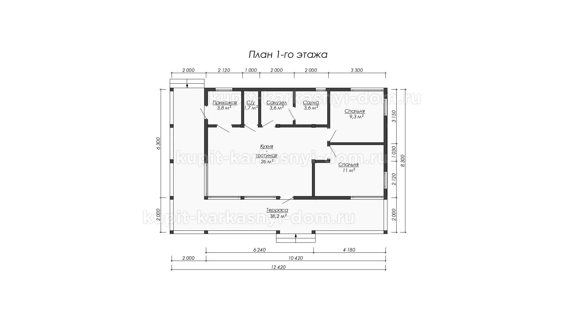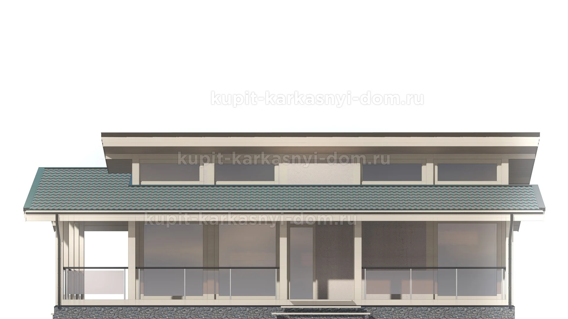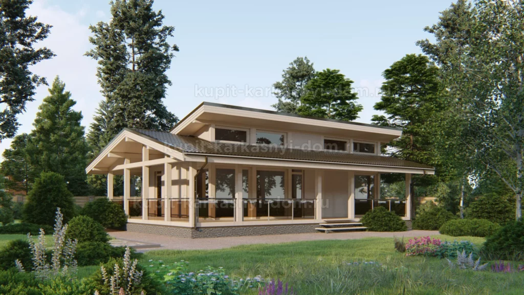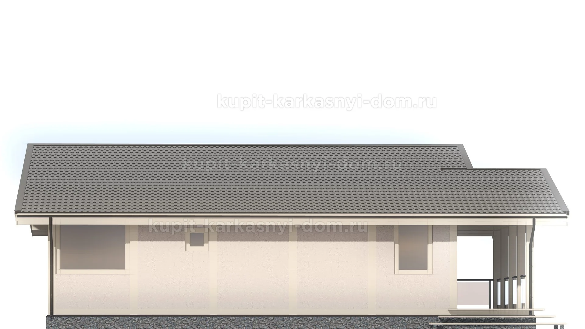 3D Проект одноэтажного фахверкового дома 12.4 на 8.3 метров, площадью 97.2 м2, c ассиметричной крышей, террасой, 2 входами.