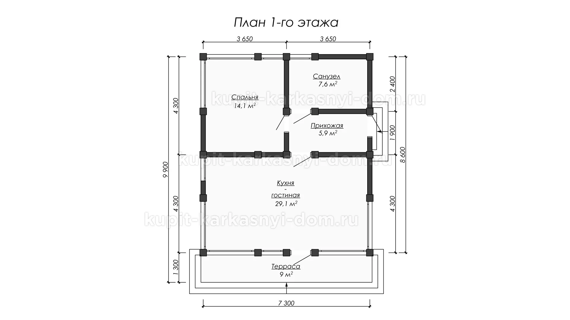 Проект одноэтажного фахверкового дома 9.9 на 7.3 метров, площадью 65.7 м2, c прямой крышей, террасой, 2 входами.